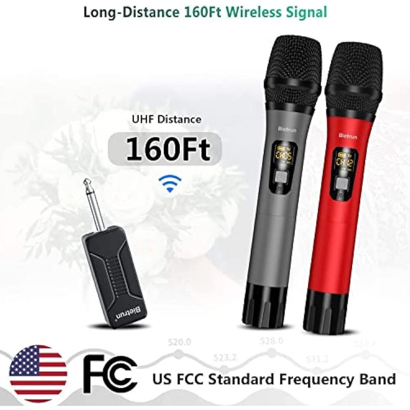 Bietrun Micrófono inalámbrico dual UHF, de mano, de metal con receptor recargable, salida de 1/4 de