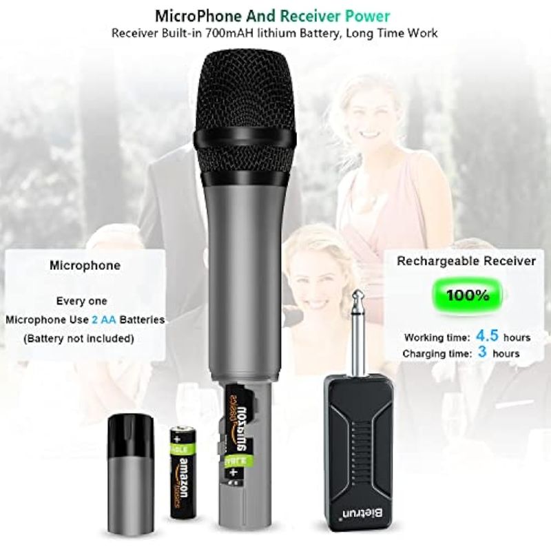 Hogar, jardín y tiempo libreInstrumentos MusicalesBietrun Micrófono inalámbrico dual UHF, de mano, de metal con receptor recargable, salida de 1/4 de